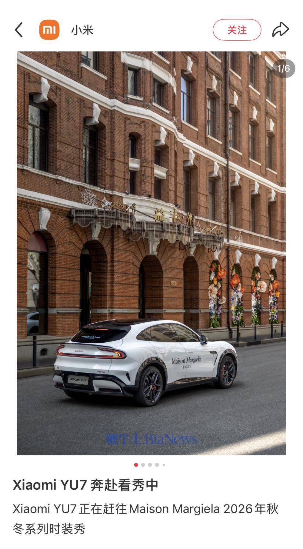 据悉,小米已官宣小米YU7将参加梅森·马吉拉2026年秋冬系列时装秀。
